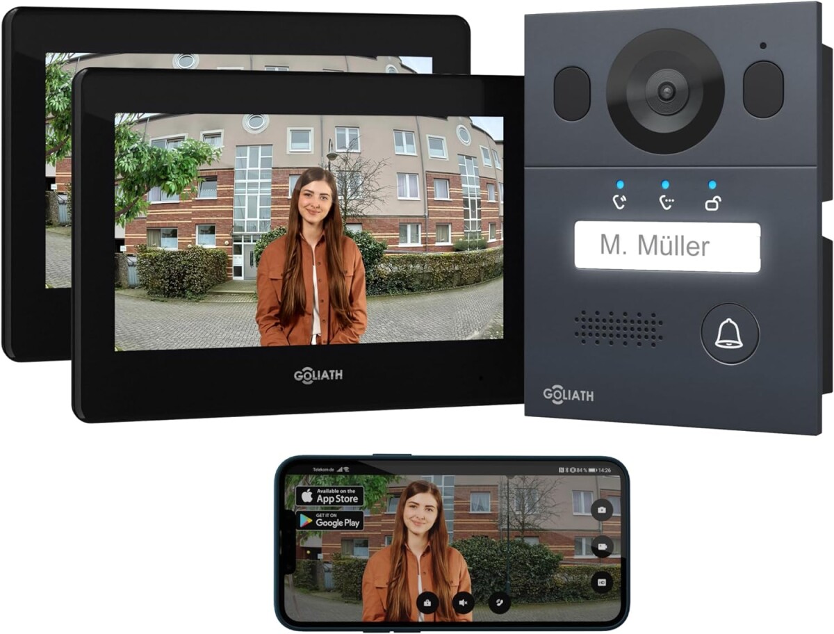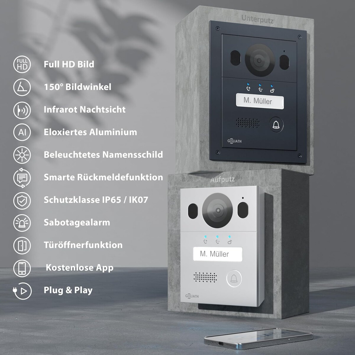 GOLIATH Basic 2-Draht BUS Türsprechanlage | FullHD | App | 150° | 1 Familie | Anthrazit/Schwarz | Unterputz | 2 x Innenstationen