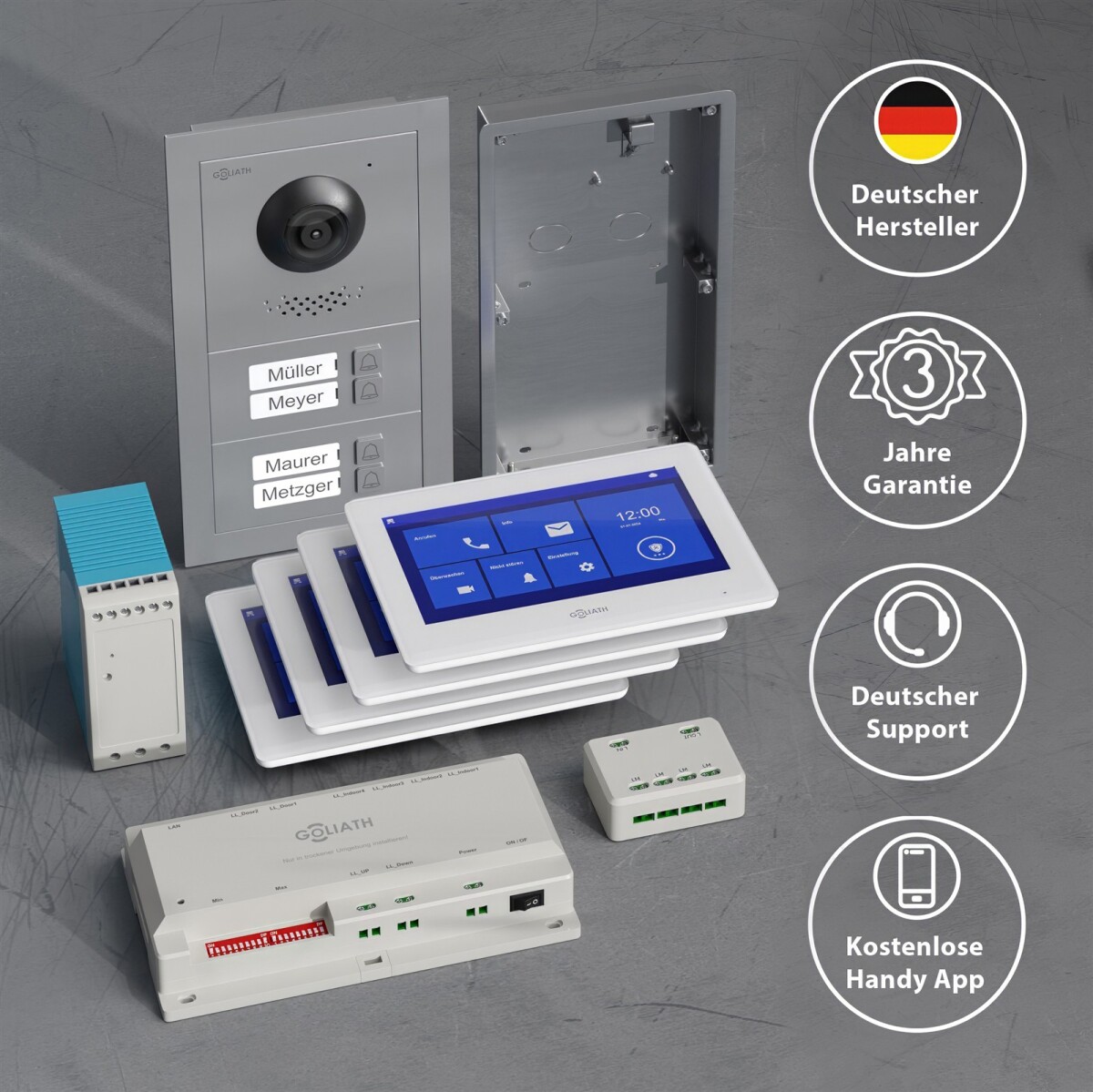 Ton, Video und Strom werden über ein 2-Draht-BUS-System sowohl an die Türstation als auch an die Innenstation übertragen. Das Set aus der Goliath Basic Line ist optimal für Einfamilienhäuser geeignet und kann einfach um zusätzliche Tür- und Innenstationen erweitert werden. Die Montage der Innenstation erfolgt mithilfe einer Halterung direkt an der gewünschten Wand.