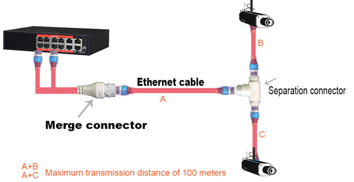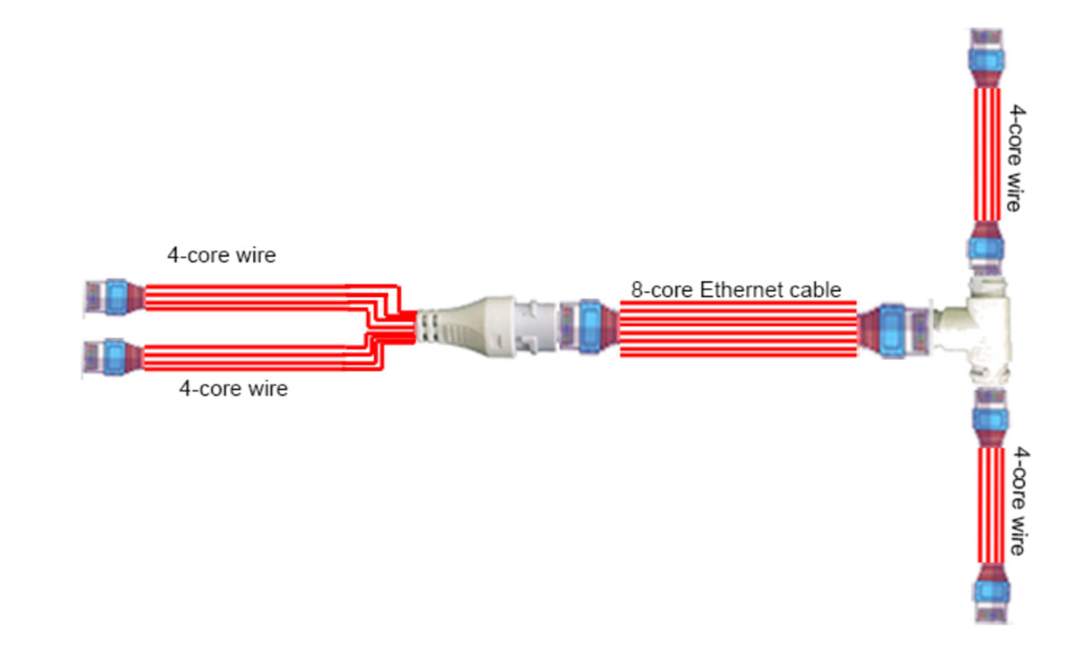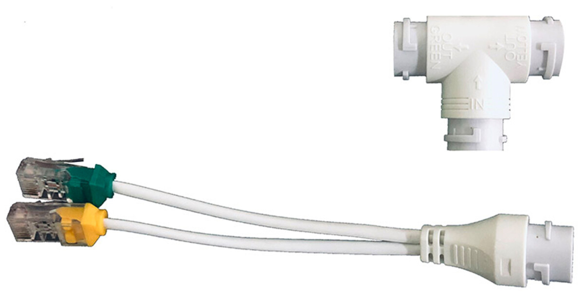 2 Einzelene 4-adrige Ethernet Kabel werden zu einem 8-adrigen Ethernetkabel konvertiert. Das T-Stück splittet das 8-adrige Kabel wieder in zwei 4-adrige Ethernetkabel auf.