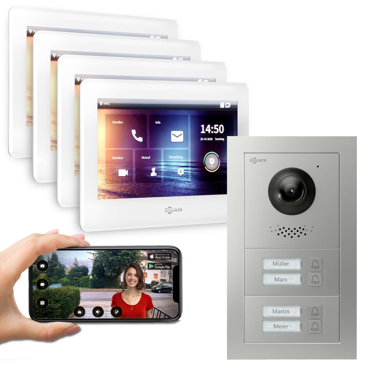 GOLIATH PRO 2-Draht BUS Türsprechanlage | App | 4 Fam | 4×7 Zoll Weiß | 180°