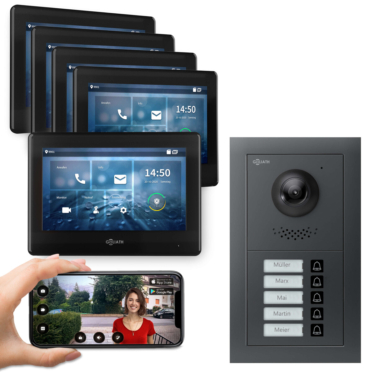 GOLIATH PRO 2-Draht BUS Türsprechanlage | App | 5 Fam | 5×7 Zoll Schwarz | 180°