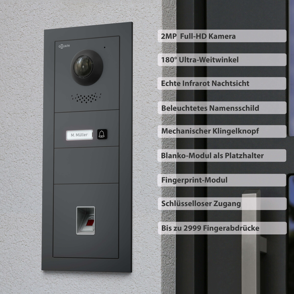 GOLIATH PRO 2-Draht BUS Video-Sprechanlage | Anthrazit | 1 Fam | 2×7″ Weiß | Fingerprint | 180°