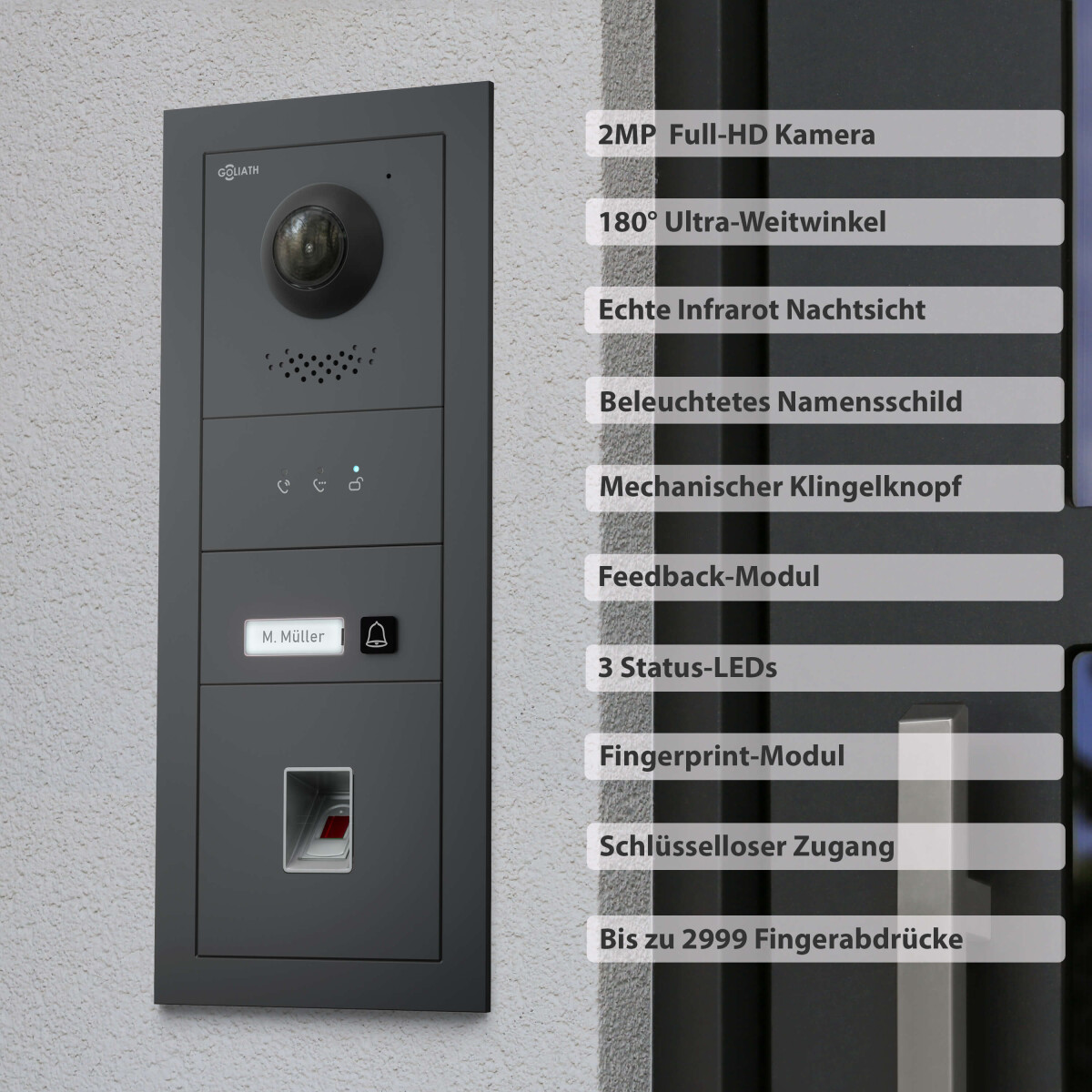 GOLIATH PRO 2-Draht BUS Videosprechanlage | Anthrazit | 1 Fam | 3×7″Schwarz | Fingerprint |180°